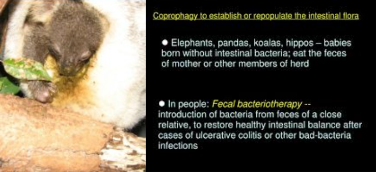 Hệ vi khuẩn ruột con gấu túi kaola có dòng vi khuẩn Synergistaceae có các enzyme thoái hóa được các lignocellulose, tanin, nhờ đó loài gấu này có khả năng ăn lá cây bạch đàn, khuynh diệp. Trước khi dứt bú, ăn lá, kaola con ăn phân của mẹ để ruột có các vi khuẩn synnergistaceae trên. Ngoài gấu tíu kaola. các nhà khoa học còn ghi nhận gấu trúc, hà mã và voi cũng ăn phân của mẹ chúng để bổ sung vi khuẩn đường ruột.
