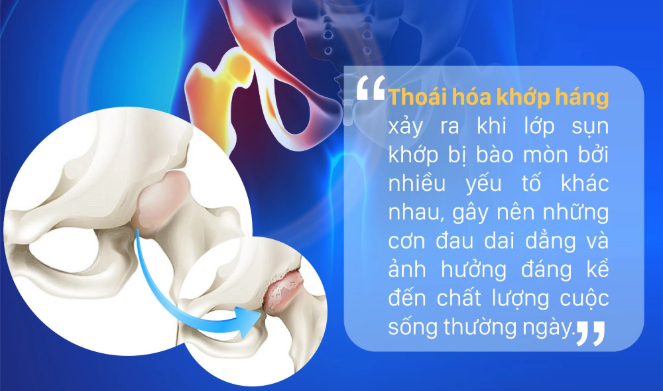 Thoái hóa khớp háng xảy ra khi lớp sụn khớp bị bào mòn bởi nhiều yếu tố khác nhau, gây nên những cơn đau dai dẳng và ảnh hưởng đáng kể đến chất lượng cuộc sống thường ngày của bệnh nhân. Nếu không có biện pháp điều trị và kiểm soát bệnh tốt ngay từ đầu, thoái hóa có thể gây biến dạng cấu trúc khớp háng dẫn đến tàn phế vĩnh viễn.